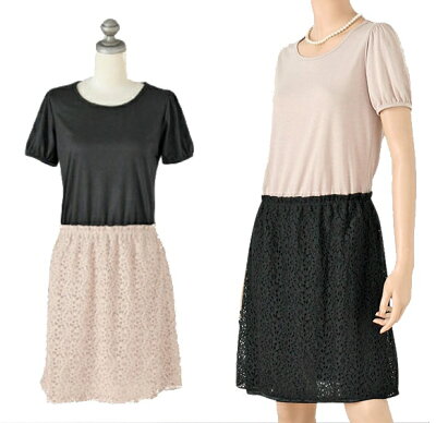 》 ◆Photo掲載関連商品: ジャケット バッグ ストール トップ部分はストレッチ性のあるT/R天竺生地(T-cloth)、ボトム部分は小さな花柄がチャーミングなフローラルモチーフの綿混紡レース! 一枚で大人可愛いコーデが完成するコンビネーション半袖ワンピースです。