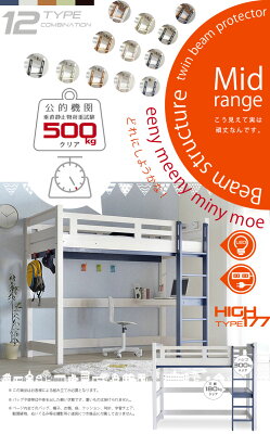 楽天最安挑戦1,000円OFFクーポン★耐荷重500kg 送料無料 セミダブル ダブル追加 【 ロフトベッド イーニー Hi basic】 Beamstructure特許構造 安心安全 エコ塗装 LED照明付 宮棚付き24色対応 耐震構造ロフトベットシステムベッドスノコベッド大人用業務用宮付き