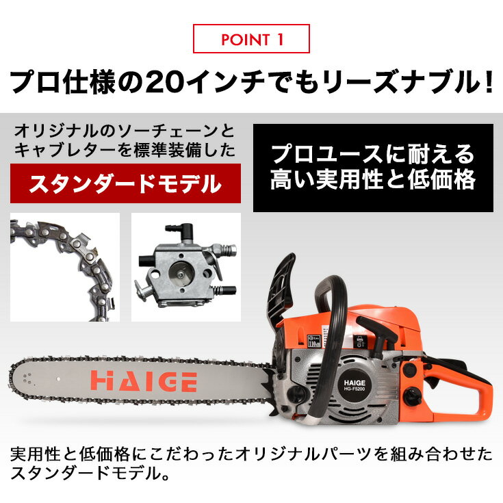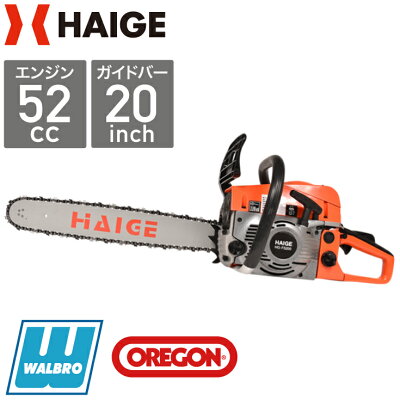 チェーンソー エンジン 20インチ(50cm) 52cc 2サイクル 3馬力 目立て 丸ヤスリ 高枝切り ウォルブローキャブ搭載 オレゴン [チェンソー 丸太 枝 木 木材]/HG-K5200【1年保証】
