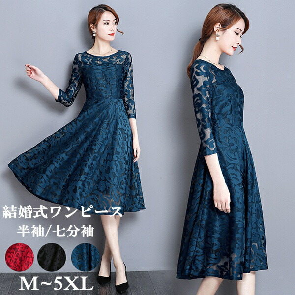 パーティードレス 大きいサイズ 結婚式 ワンピース フォーマル ワンピース ミモレ丈 袖あり 結婚式ワンピース 半袖 七分袖 春夏 秋冬 20代 30代 40代 結婚式 二次会 謝恩会 披露宴 成人式 卒業式 母 入学式 ママ 参観日 お呼ばれ お出かけ ブラック ブルー ワインレッド