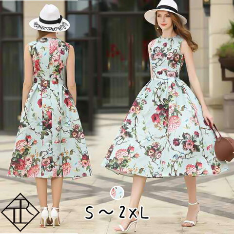 パーティードレス 結婚式 ドレス ワンピース レディース 二次会 お呼ばれ パーティー 大きいサイズ ミディアム ラウンドネック ノースリーブ 花柄 フレアスカート フォーマル エレガント 上品 クラシック 清楚 デート セレブ 綺麗 20 30