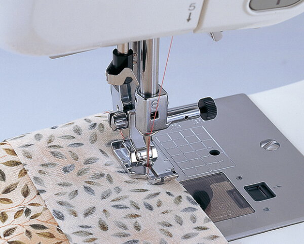 コンピューターミシン〜電子ミシン〜おさえ押さえ〜ミシンアタッチメント ピーシング押え【F001N】【brother】【パッチワーク・キルト用】 1/4インチ(6.4mm)の縫い代で縫い合わせたい時は押えの右側に 1/8インチ(3.2mm)のステッチの入れたい時は押えの左側に 目安になる縫い目等を合せて縫うと一定幅できれいに縫う事が出来ます。