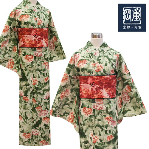 【岡重】浴衣 芥子の花 緑×朱色 レディース フリーサイズ