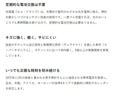 商品情報製品スペック商品番号ES9384-50WキャリバーNo.H060動力光発電エコ・ドライブ精度±15秒/月(非受信時)持続時間光発電3年(パワーセーブ作動時)電波受信日中米欧電波受信重量40g厚み8.5mmケースサイズ横 26.2mmケース素材スーパーチタニウムケース表面処理デュラテクトサクラピンク(サクラ色)バンド素材・タイプスーパーチタニウム三ツ折れプッシュタイプバンド調整可能サイズ135〜174mmガラスサファイアガラス(クラリティ・コーティング)防水性能5気圧防水アレルギーレベル耐ニッケルアレルギー耐磁性能耐磁1種デザイン特徴白蝶貝文字板 白蝶貝彫刻文字板:5ポイントダイヤ入ケース:10ポイントダイヤ入夜光(針)裏ぶたに都市表示を刻印機能充電残量表示機能充電警告機能過充電防止機能パワーセーブ機能フル充電時約3年可動(パワーセーブ作動時)日中米欧電波受信受信局自動選択機能定時受信機能強制受信機能パーペチュアルカレンダー日付表示ダイレクトフライトワールドタイム(24時差)サマータイム機能パーフェックス(JIS1種耐磁、衝撃検知機能、針自動補正機能)原産国日本製メーカー保証1年間メーカー保証(MY CITIZENご登録により2年間)※重量、厚み、サイズは参考値としてご参照ください。