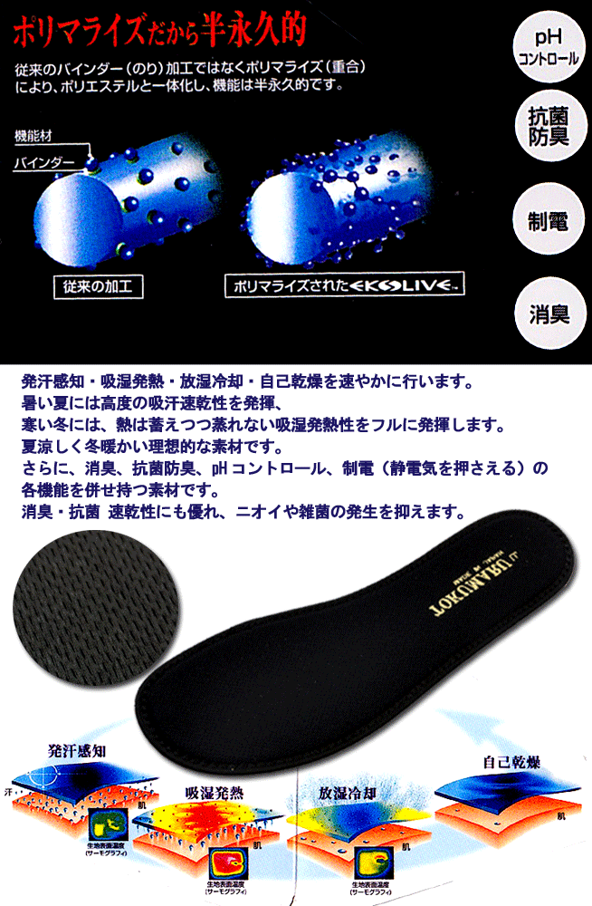 節電対策、クールビズにも抗菌防臭・消臭効果、冬は暖かく、夏はサラっと爽やか/安心の日本製/オフィスサンダルにも使える/エクスライブ ウエッジサンダル